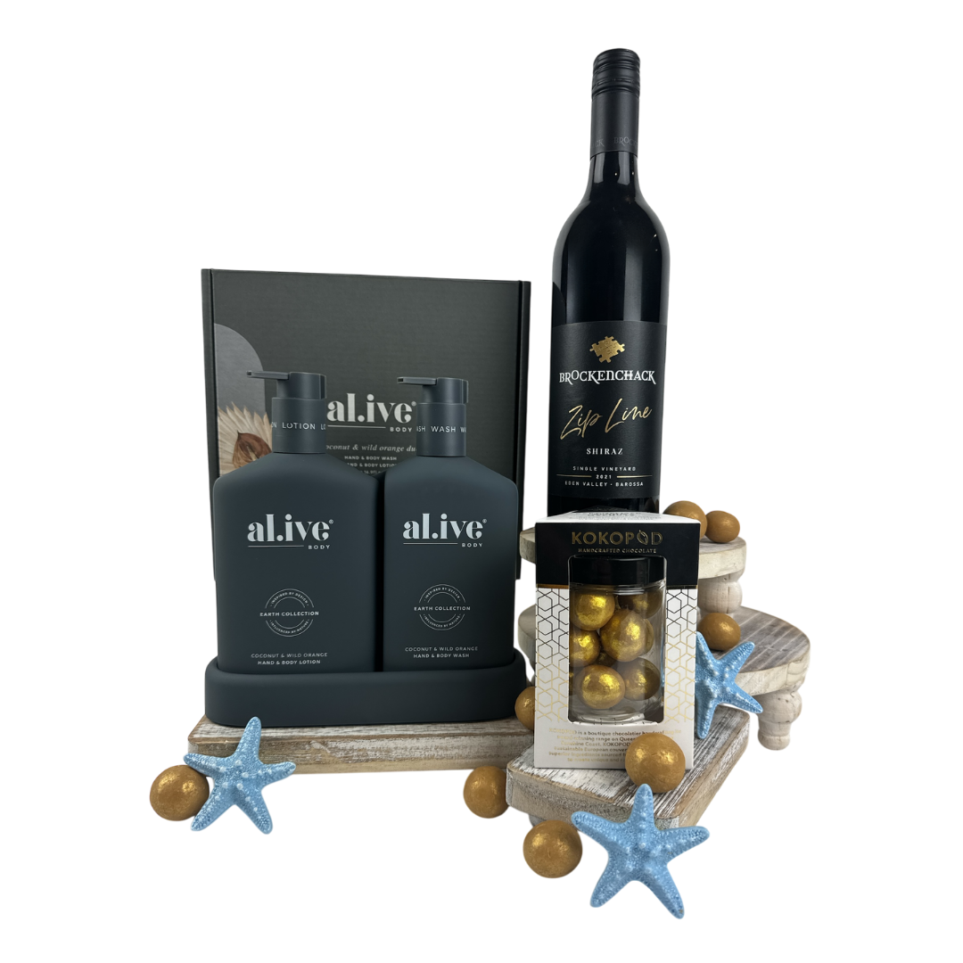 A well-balanced gift for the modern man, Al.ive for Him blends relaxation and indulgence. Featuring Brockenchack’s bold ‘Zipline’ Shiraz, the Al.ive Coconut & Wild Orange body care duo, and roasted macadamias from the Sunshine Coast, this hamper is perfect for birthdays, Father’s Day, or just-because gifting.