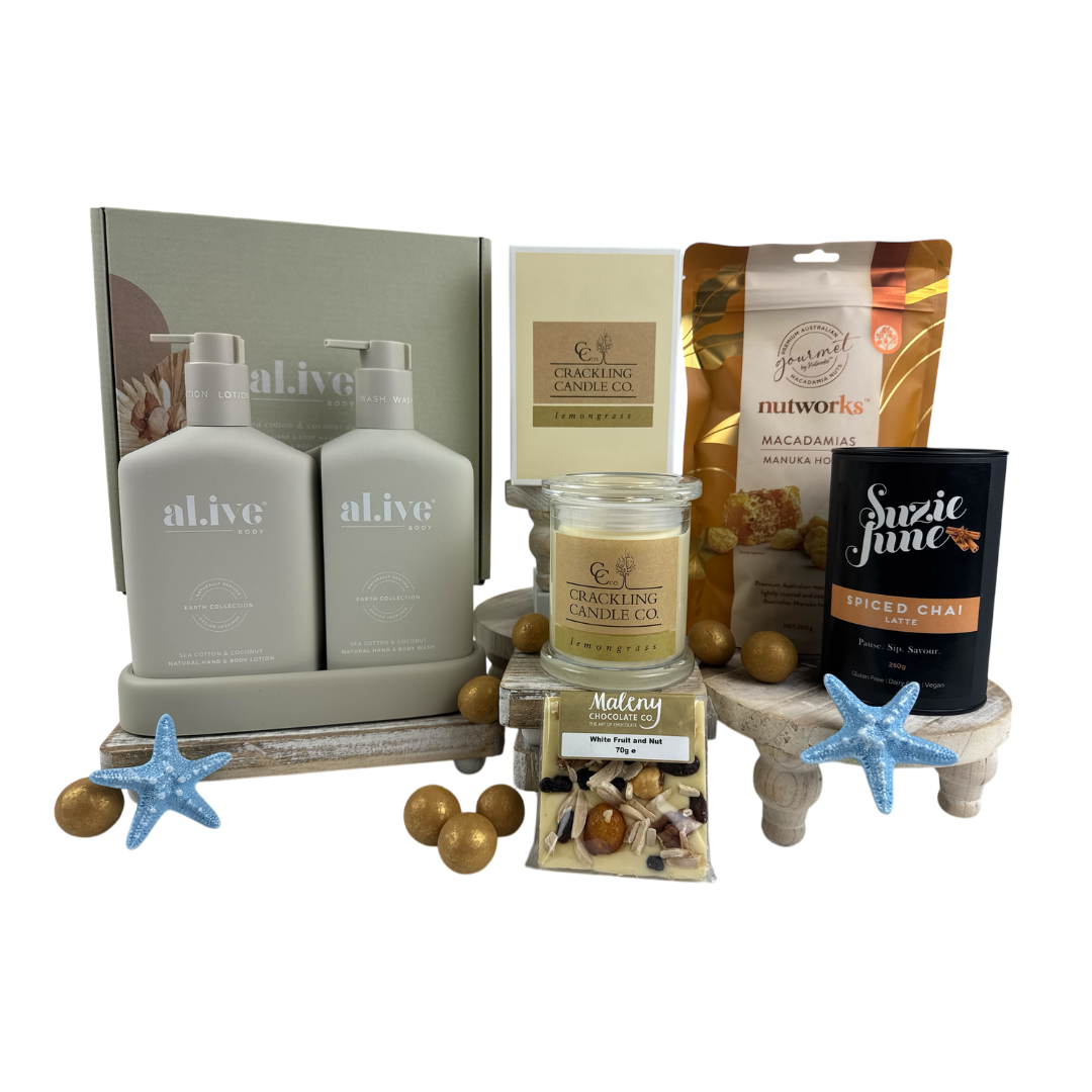 The Al.ive Retreat hamper brings the calm of a spa day to your doorstep. Featuring the al.ive Sea Cotton & Coconut Body Duo, this set is beautifully paired with Suzie June’s artisan spiced chai latte blend, Maleny Chocolate Co’s fruit & nut bar, and Nutworks’ Manuka Honey macadamias – all locally made on the Sunshine Coast. A small scented candle from Crackling Candle Co completes this tranquil experience. Thoughtful, nourishing and beautifully packaged – ideal for birthdays, thank-yous, or moments of rest.