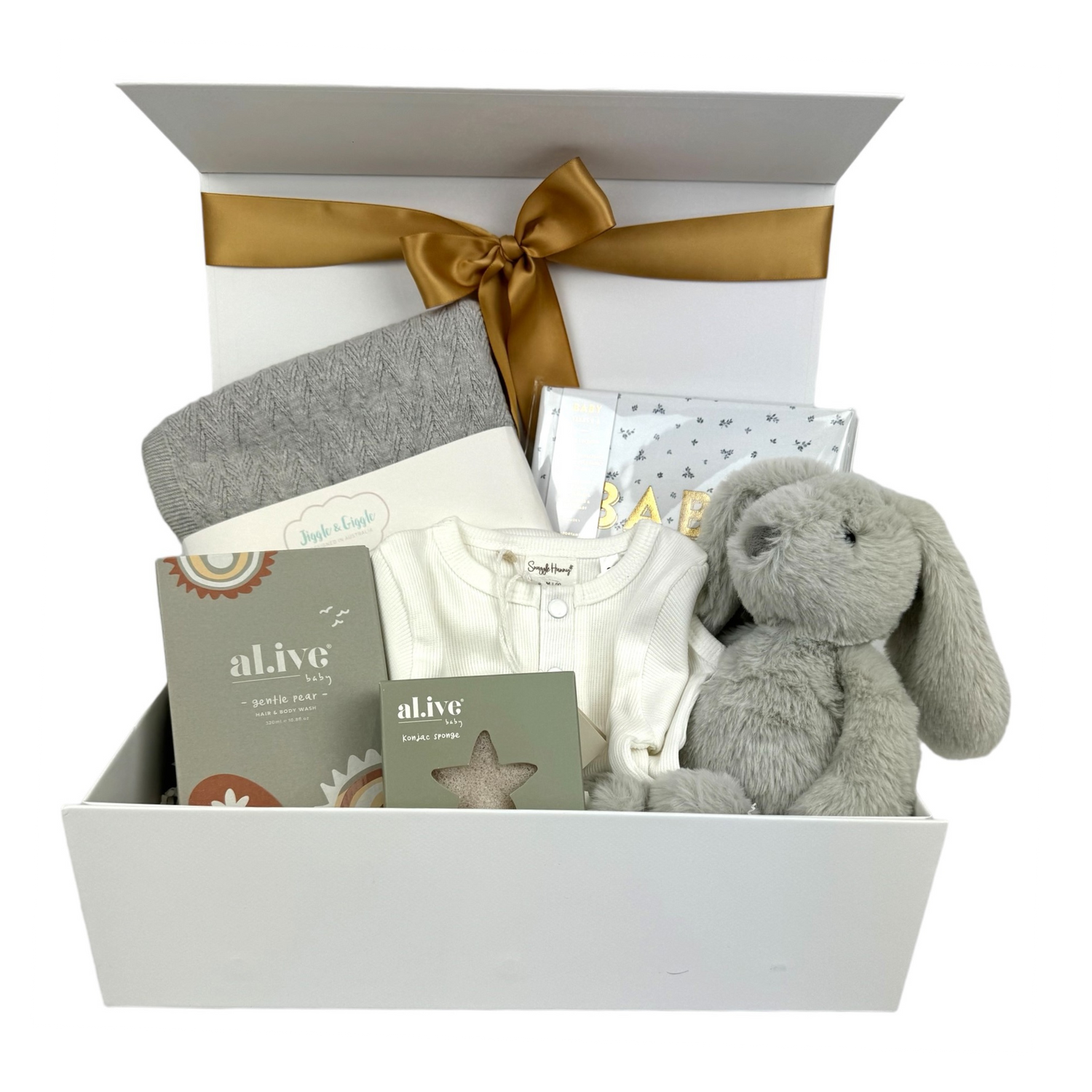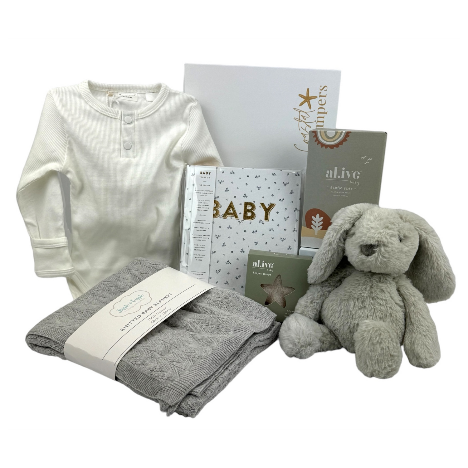 Welcome, little one! The Bunny Grey Hamper is thoughtfully designed with gender-neutral essentials to make your new arrival feel cherished, featuring a baby book, gentle body wash, a cozy outfit, a soft blanket, and an adorable bunny teddy.