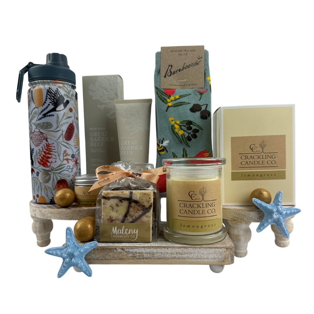 Hydrate, unwind, and enjoy life’s little comforts with the Calm & Hydrate hamper. This refreshing gift box includes the Annabel Trends Watermate drink bottle in Blue Magpie print, a Maine Beach hand & nail cream (Great Barrier Reef edition), and pampering touches like a Crackling Candle Co candle and car scent, soft Bamboozld socks, and Maleny Chocolate Co's artisan chocolate bark. With a perfect mix of practical and indulgent, this Sunshine Coast hamper makes a thoughtful gift for birthdays, wellness, or appreciation.