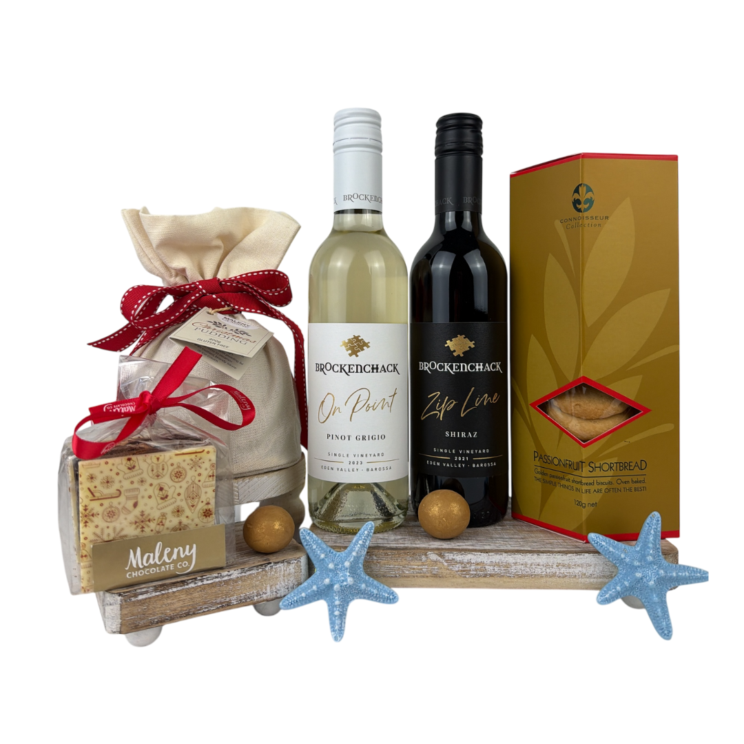 The Christmas Indulgence Hamper is a festive treat for wine and gourmet lovers. It features Brockenchack 375ml bottles of ‘On Point’ Pinot Grigio and ‘Zipline’ Shiraz, Maleny Cuisine Christmas pudding, and local artisan sweets including Maleny Chocolate Co. Christmas Chocolate Bark Bag and Connoisseur Collection Passionfruit Shortbread — a luxurious and indulgent way to celebrate the season.