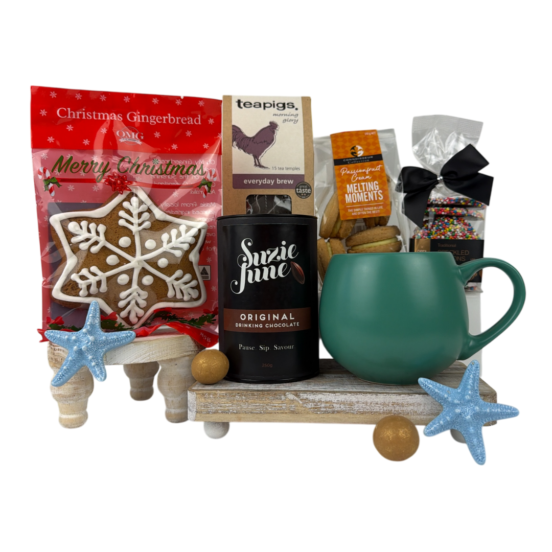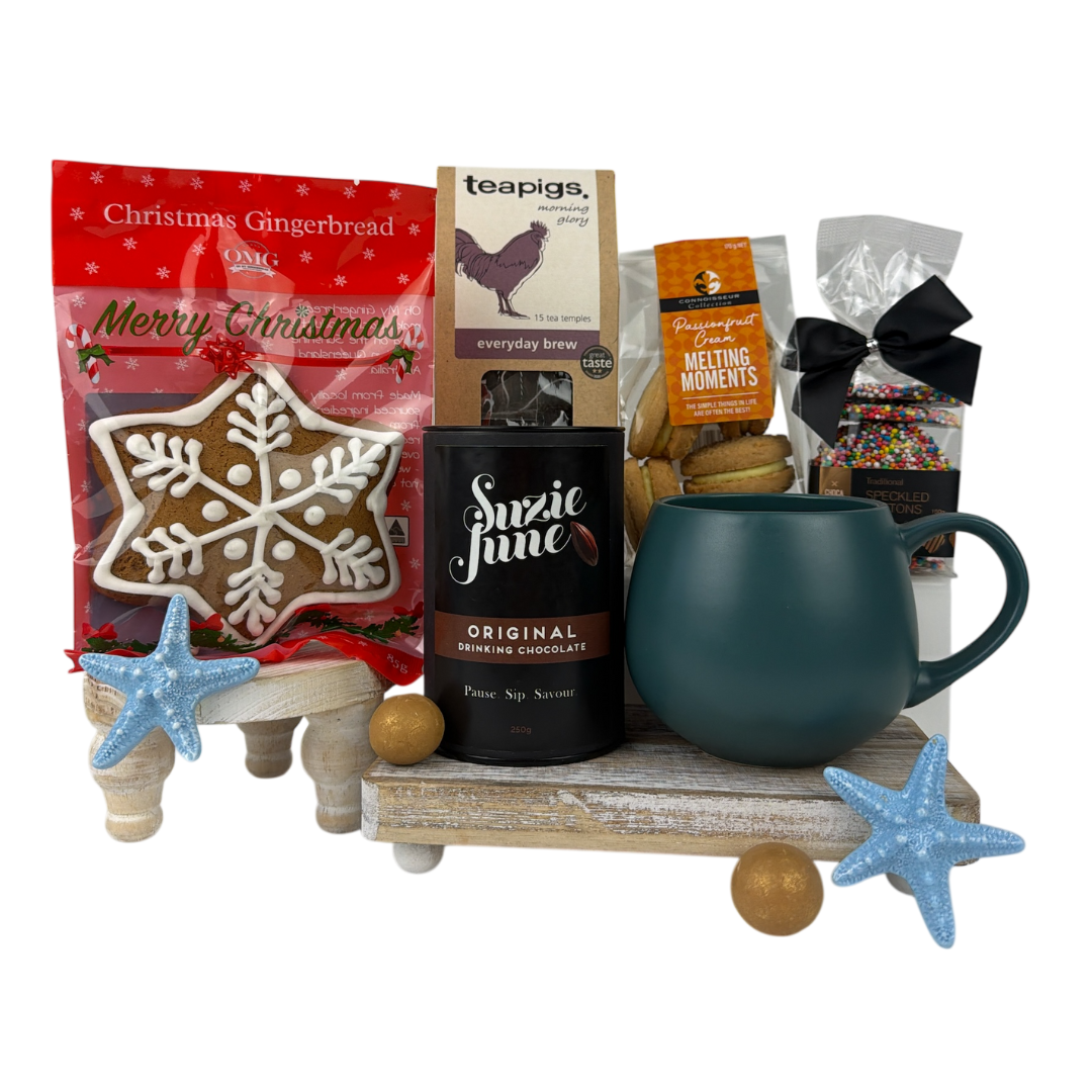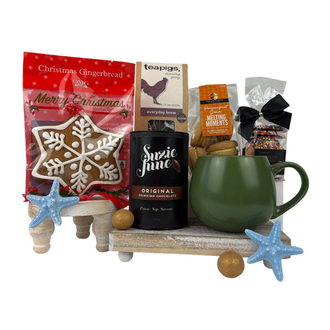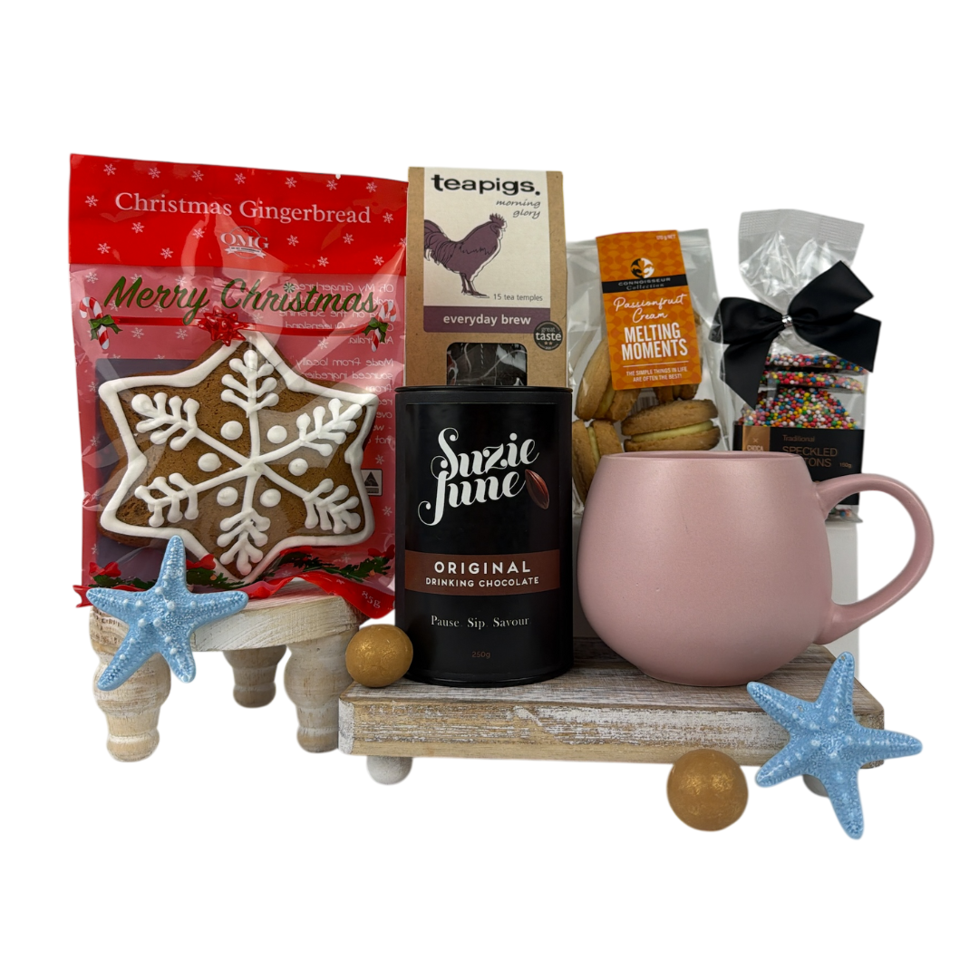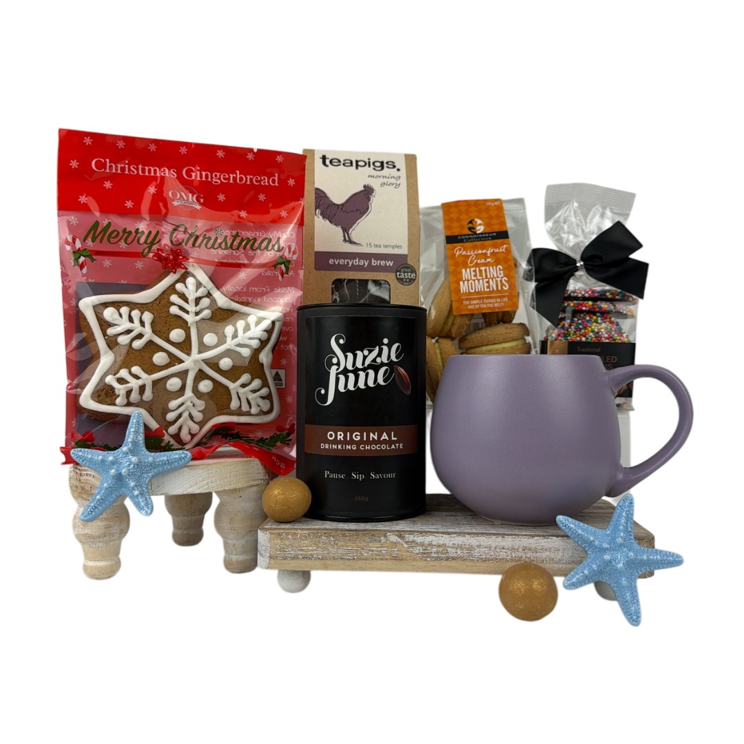 The Christmas Wishes Hamper brings festive delight with Suzie June drinking chocolate, a gingerbread star, Tea Pigs ‘Morning Glory’ tea, a stylish Soren Ashby mug, and indulgent sweet treats. Perfect for celebrating the season in style.