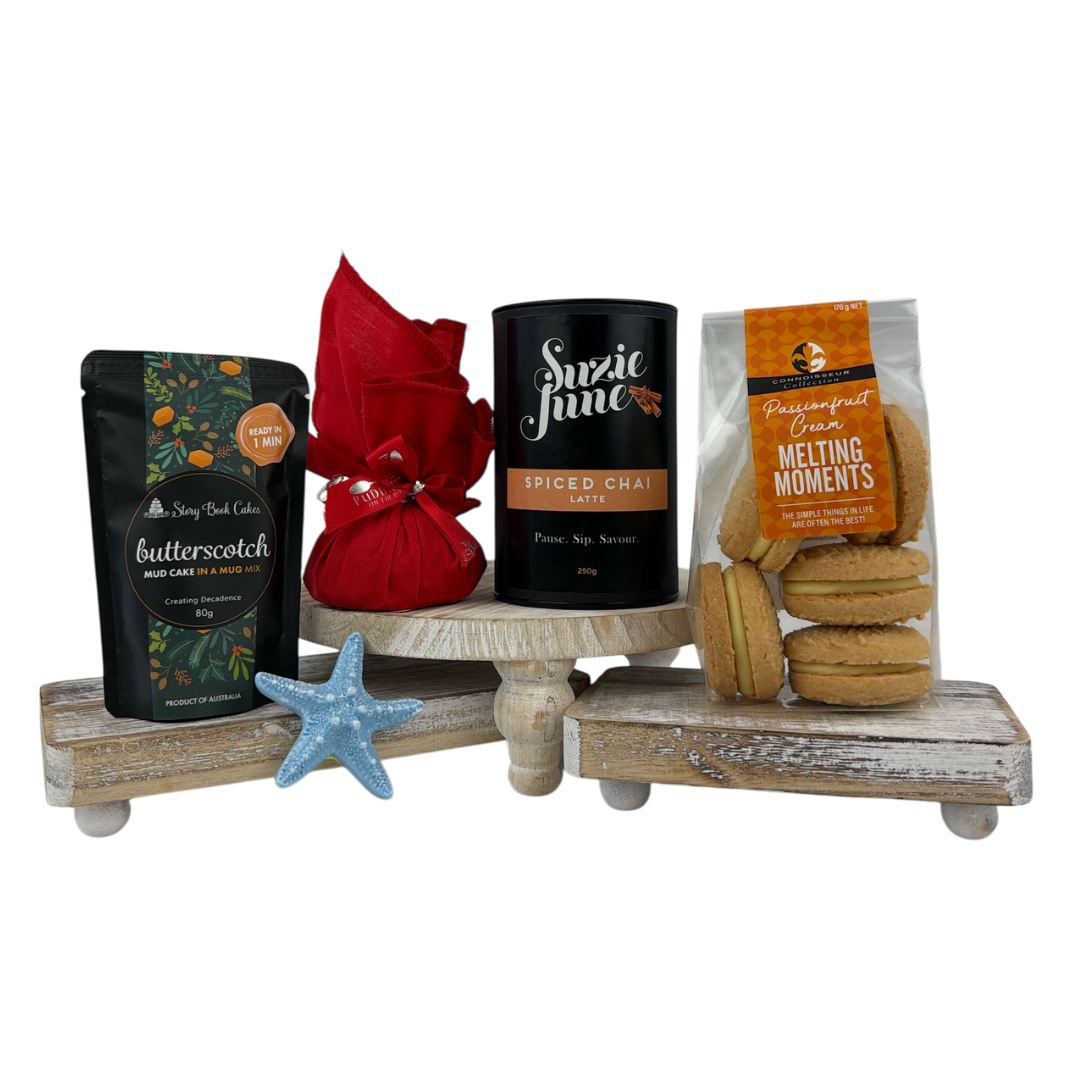 Create a moment of comfort this Christmas with our Cosy Moments Mini Hamper. This warm and inviting treat box includes Suzie June’s Spiced Chai Latte, a Mini Christmas Pudding, a rich Butterscotch Mud Cake in a Mug from Story Book Cakes, and decadent Passionfruit Melting Moments. The perfect petite gift for teachers, neighbours, clients, or anyone who deserves a little cosy indulgence this festive season.