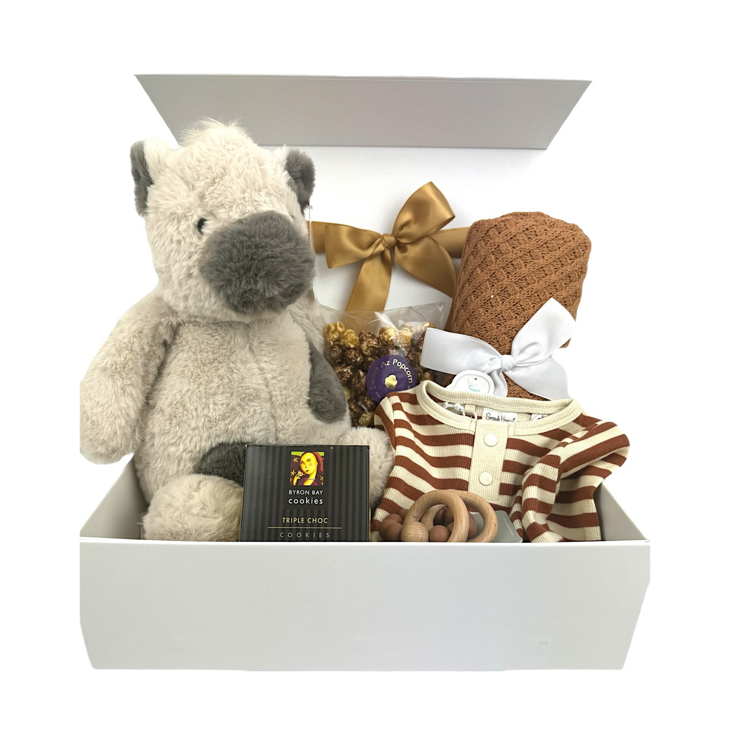 Our Donkey Delight Baby Hamper, is the perfect hamper to welcome the newest addition. This adorable hamper includes a soft and stretchy long sleeve bodysuit by Snuggle Hunny for playtime and cuddle sessions, a cuddly knit blanket to keep the little one warm, and a teething toy to help with teething. And let's not forget mum, with some sweet treats. The cute donkey teddy becomes a treasured playmate for endless hours. This thoughtfully assembled hamper is the ideal way to welcome any new arrival.