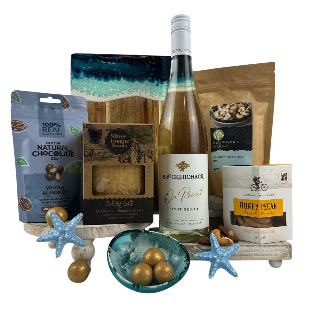 Celebrate long lunches, golden afternoons, and meaningful moments with the Endless Summer Spoils hamper. Featuring Brockenchack ‘On Point’ Pinot Grigio and a collection of gourmet delights including celery salt sourdough crackers, chocolate-coated almonds, honey pecan biscuits, and salted nuts. This luxe hamper is elevated with a stunning resin cheeseboard and bowl handcrafted by Sunshine Coast artist Seajay Art. A beautiful gift for birthdays, housewarmings, weddings or coastal-inspired celebrations.