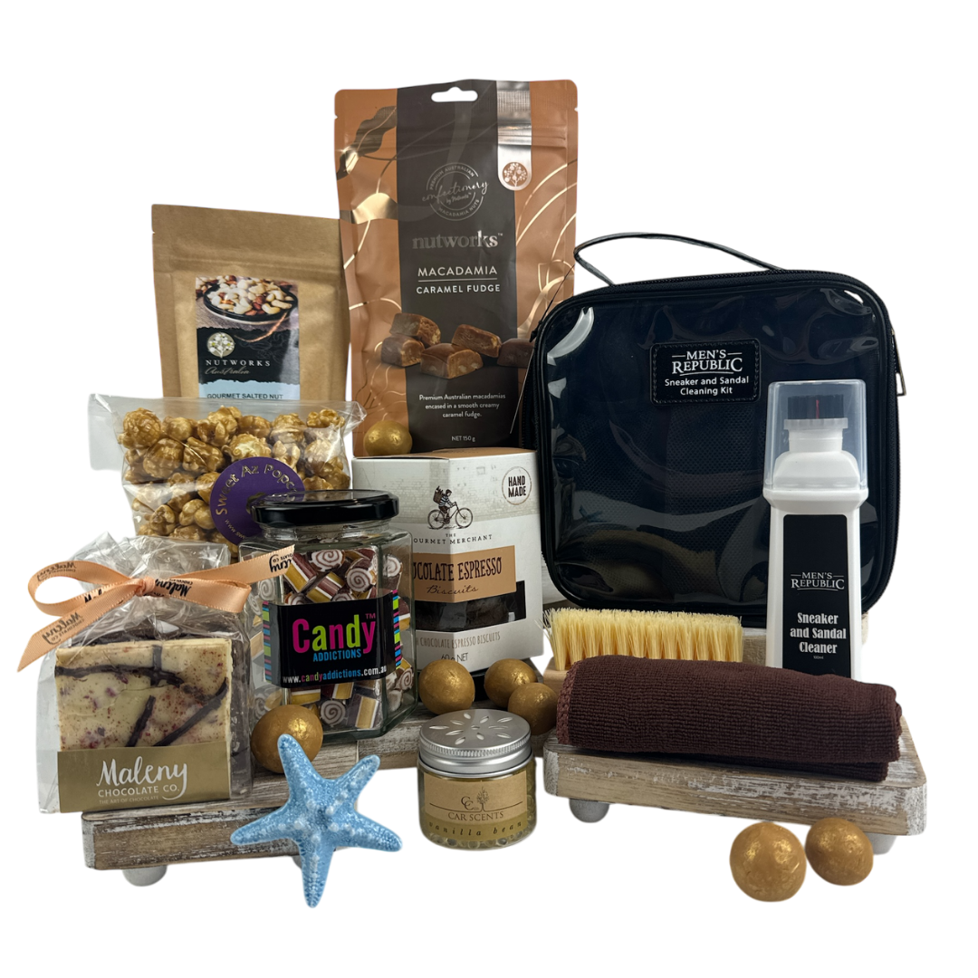 For the modern man who appreciates both order and indulgence, the Gentleman’s Treat & Tidy hamper delivers. Featuring a Men's Republic Sneaker & Sandal Cleaning Kit, a luxe vanilla bean car scent, and a handpicked selection of Sunshine Coast-made sweets and snacks including macadamia caramel fudge, popcorn, rock candy, and more. A fun and functional gift for birthdays, Father’s Day or just because.