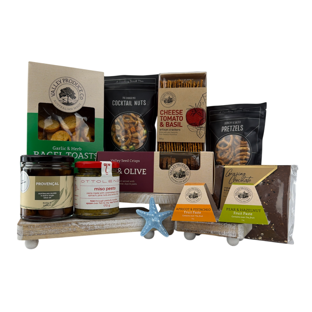 The Gourmet Grazer Hamper is made for the entertainer. Indulge in a selection of artisan flavours including Coolbardie olives, Valley Produce Co crackers, bagel toasts, and fruit pastes, and Choco Mama savoury snacks, finished with Finch Ave Toasted Sesame Grazing Chocolate and Ottolenghi’s rich Miso Pesto. A perfect balance of savoury and sweet, this gourmet hamper is ideal for picnics, grazing platters, or thoughtful gifting.