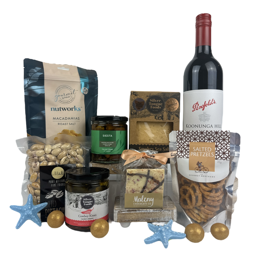 Pairing Penfolds Shiraz with bold, gourmet flavours, this hamper features small-batch olives, chocolate bark, artisan crackers, and premium nuts – with standout inclusions from Sunshine Coast makers. A deliciously refined gift for lovers of red wine and quality produce.