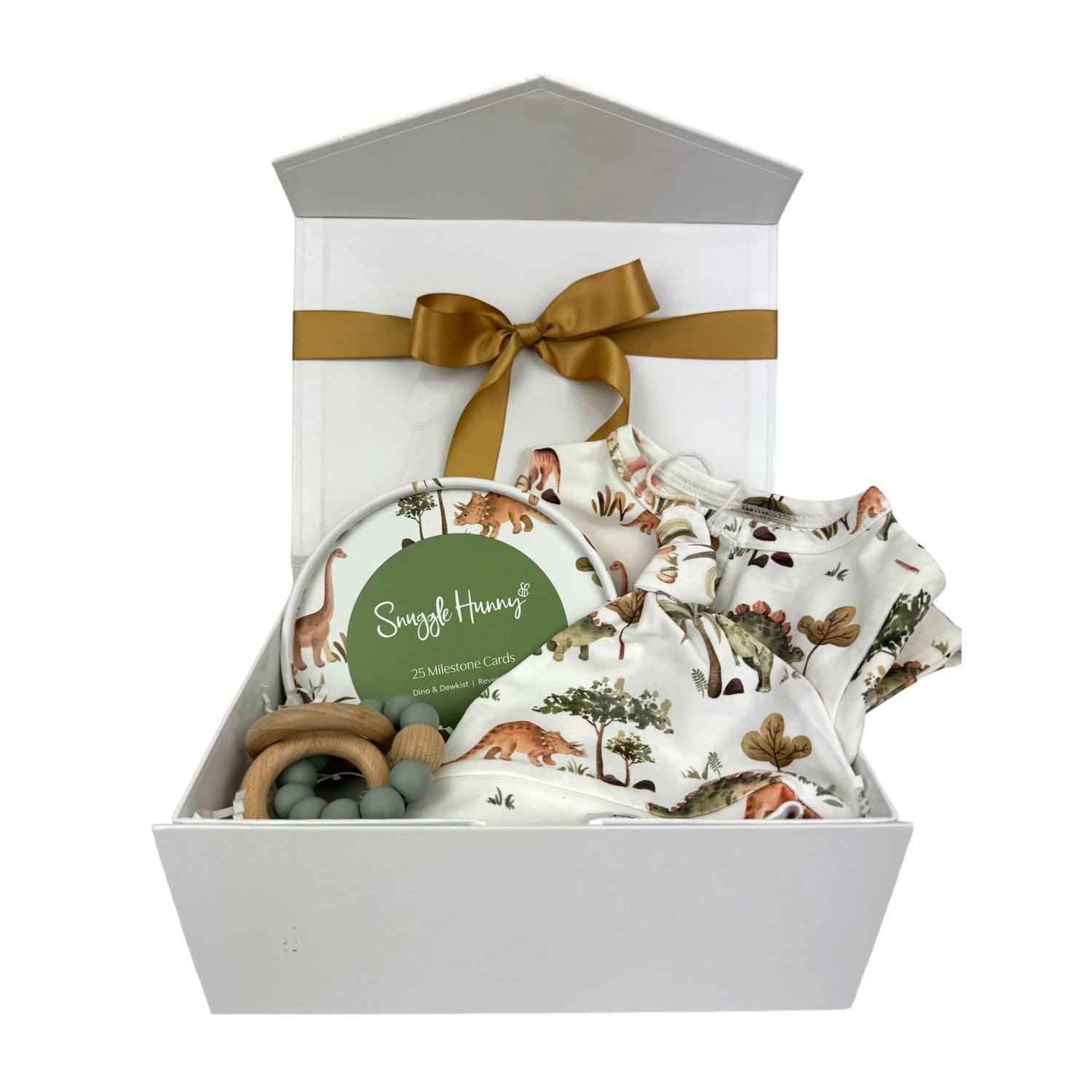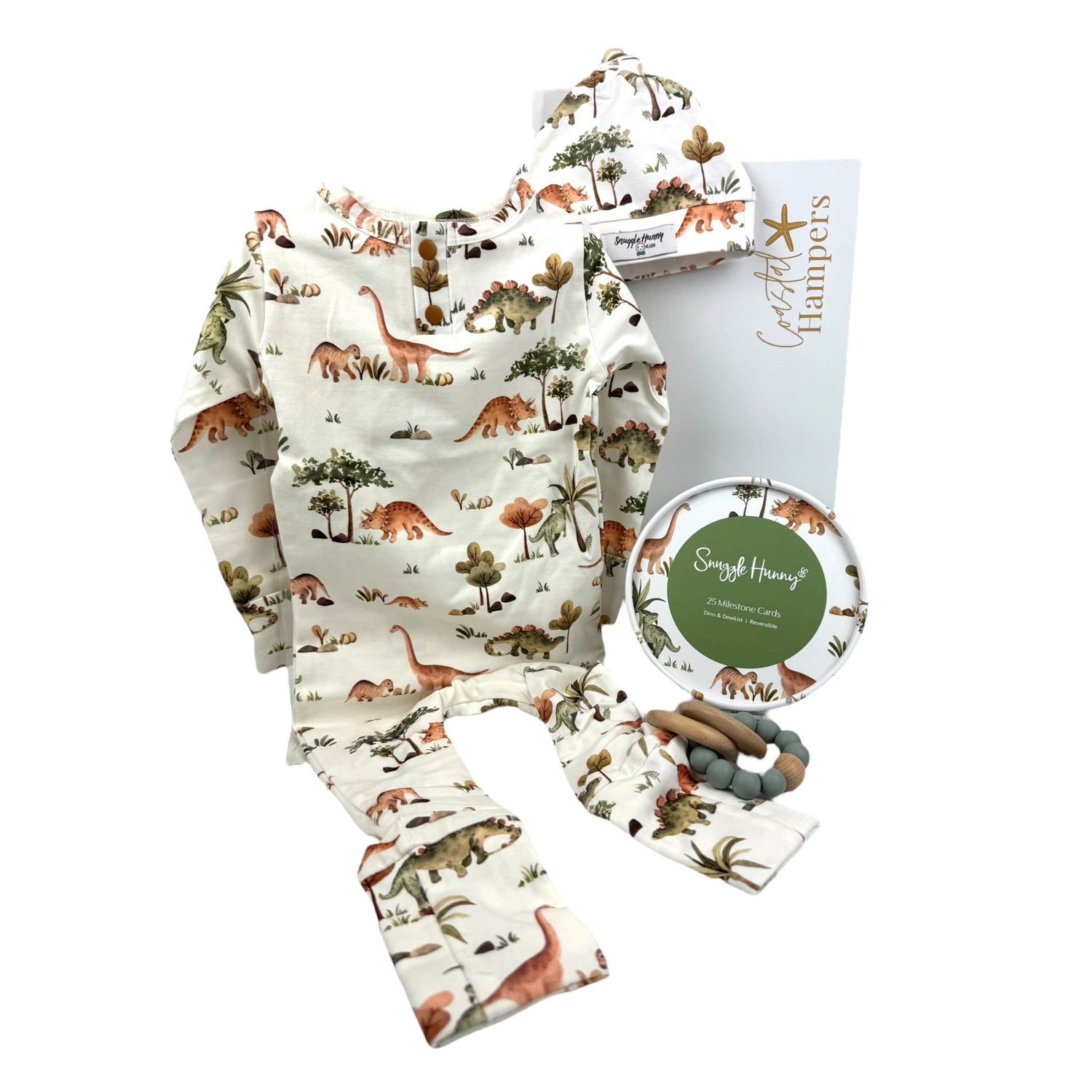 The perfect gift for new parents; a unique 'Hello Dino' Baby Hamper. Set them up for the full on dino-dream with this stunning combo, featuring a sweet dinosaur print growsuit and matching beanie - perfect to welcome those first special moments. To document every stage, use the milestone cards to capture each moment, adding a touch of fun to memories that will be cherished forever. This hamper also comes with a silicone teether to soothe sore baby gums, making it the perfect gift at all! Wonderful for baby showers, new baby gifts or just a little — hello!