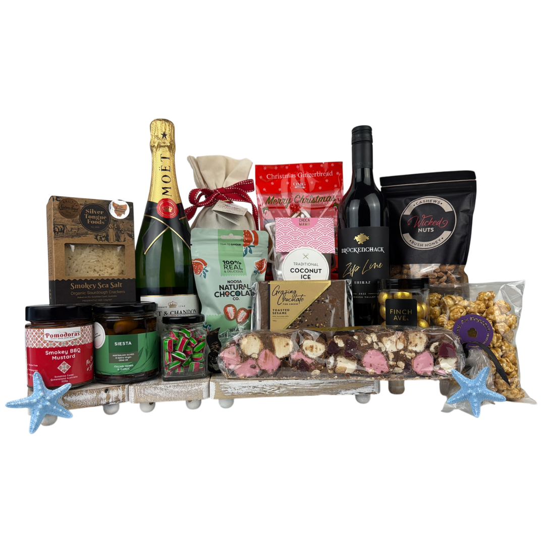 Celebrate the festive season with our Merry Christmas Hamper — a show-stopping blend of elegance and indulgence. This premium hamper features Moët & Chandon Brut, Brockenchack ‘Zip Line’ Shiraz, and a curated selection of Sunshine Coast favourites including gourmet crackers, olives, handmade sweets, and Christmas pudding. Perfect for both corporate gifting and personal celebrations, this luxurious Christmas hamper embodies the spirit of giving with local flavour and timeless style.