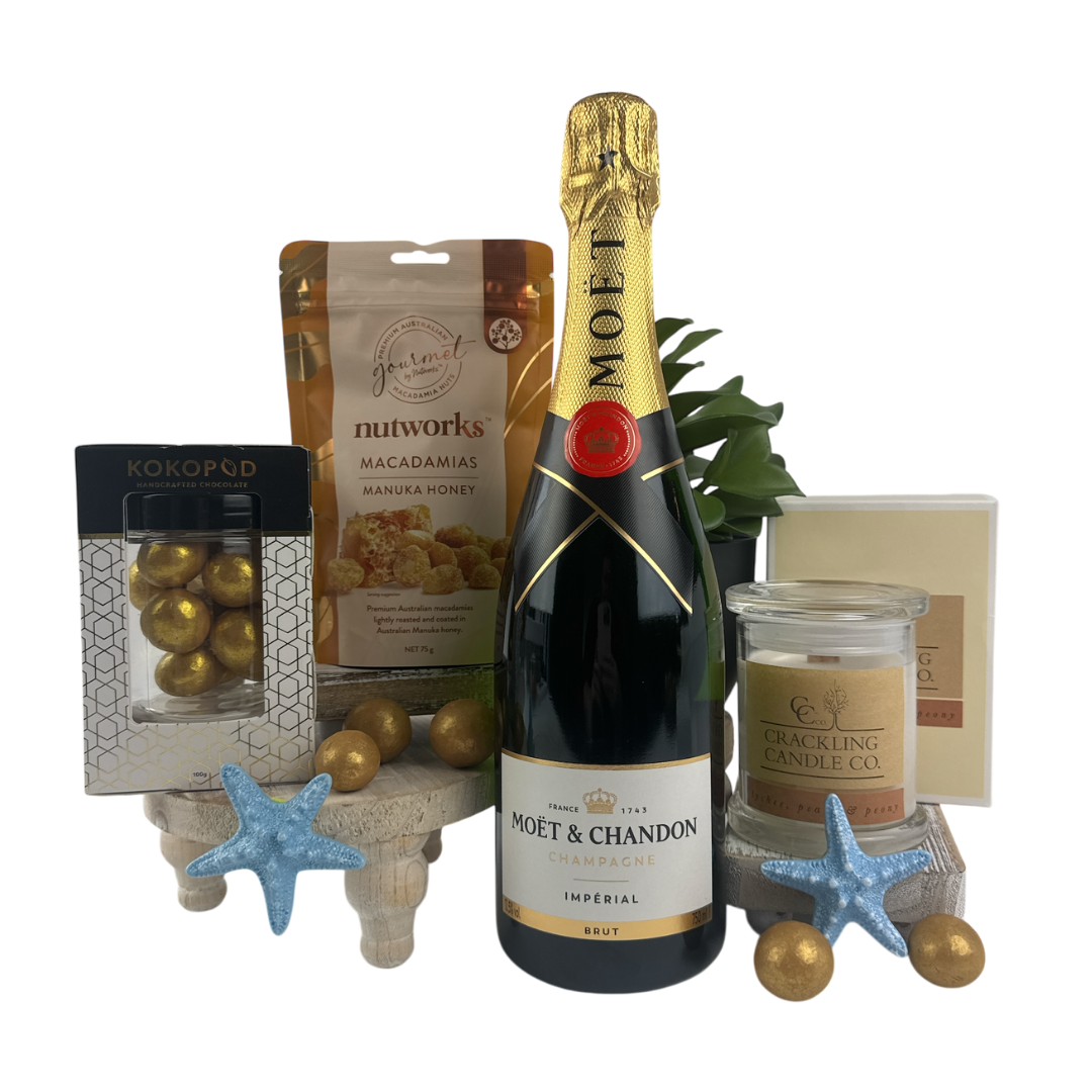 Pop the cork and indulge with our Moet & Macs hamper – featuring the iconic Moet & Chandon Champagne, sweet roasted blond macadamias, and a beautifully scented Sunshine Coast candle in lychee, peach & peony. A luxurious gift for milestone moments, celebrations or stylish thank-yous.