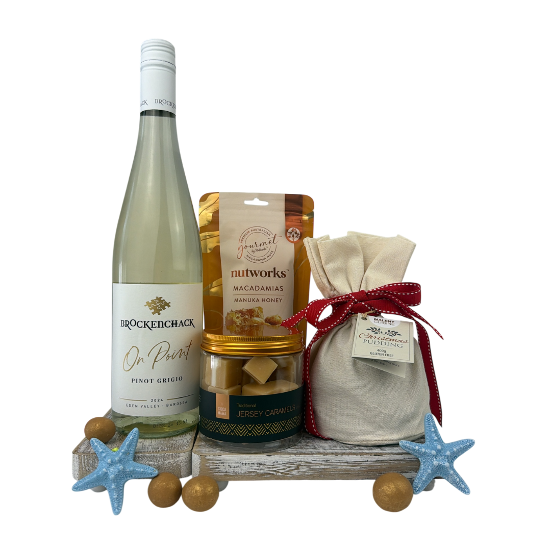 The Pudding & Pour Hamper is a festive indulgence combining Brockenchack ‘On Point’ Pinot Grigio with Maleny Cuisine Christmas pudding, Manuka honey macadamias, and Chocamama Jersey Caramels. It’s a luxurious Christmas gift for wine and sweet treat lovers alike.