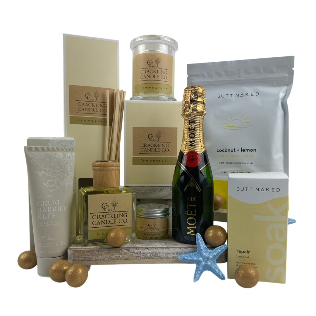 Bright, bubbly and beautifully balanced, the Summer Lemon hamper is the perfect fusion of luxury and refreshment. Pop the Moët & Chandon Piccolo, then indulge in a zesty Coconut & Lemon Sugar Scrub and soothing Repair Soak from Butt Naked. Pamper skin with Maine Beach’s Great Barrier Reef Hand & Nail Cream, and uplift the senses with a boxed candle, diffuser and car scent from Crackling Candle Co – all locally made on the Sunshine Coast. Beautifully presented in a premium magnetic-close gift box, it’s a stunning gift for birthdays, thank-yous, or sun-soaked self-care.