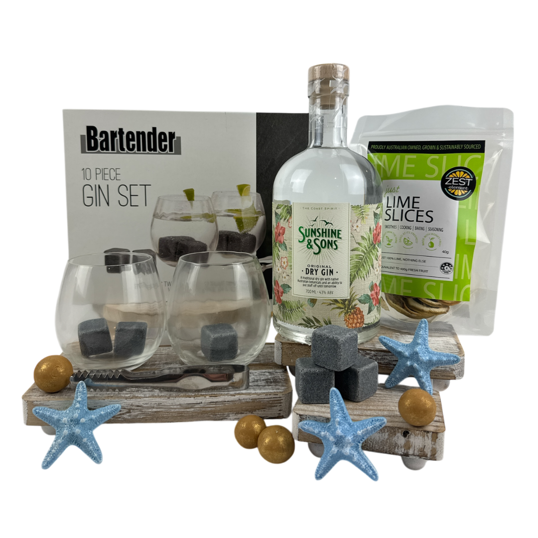 Create the ultimate coastal gin & tonic experience with Sunshine & Sons Dry Gin, a beautifully presented bartender set complete with glasses, gin stones, and tools, plus locally made dried lime slices. A refined Sunshine Coast gift for celebrations, housewarmings, or relaxed summer evenings.