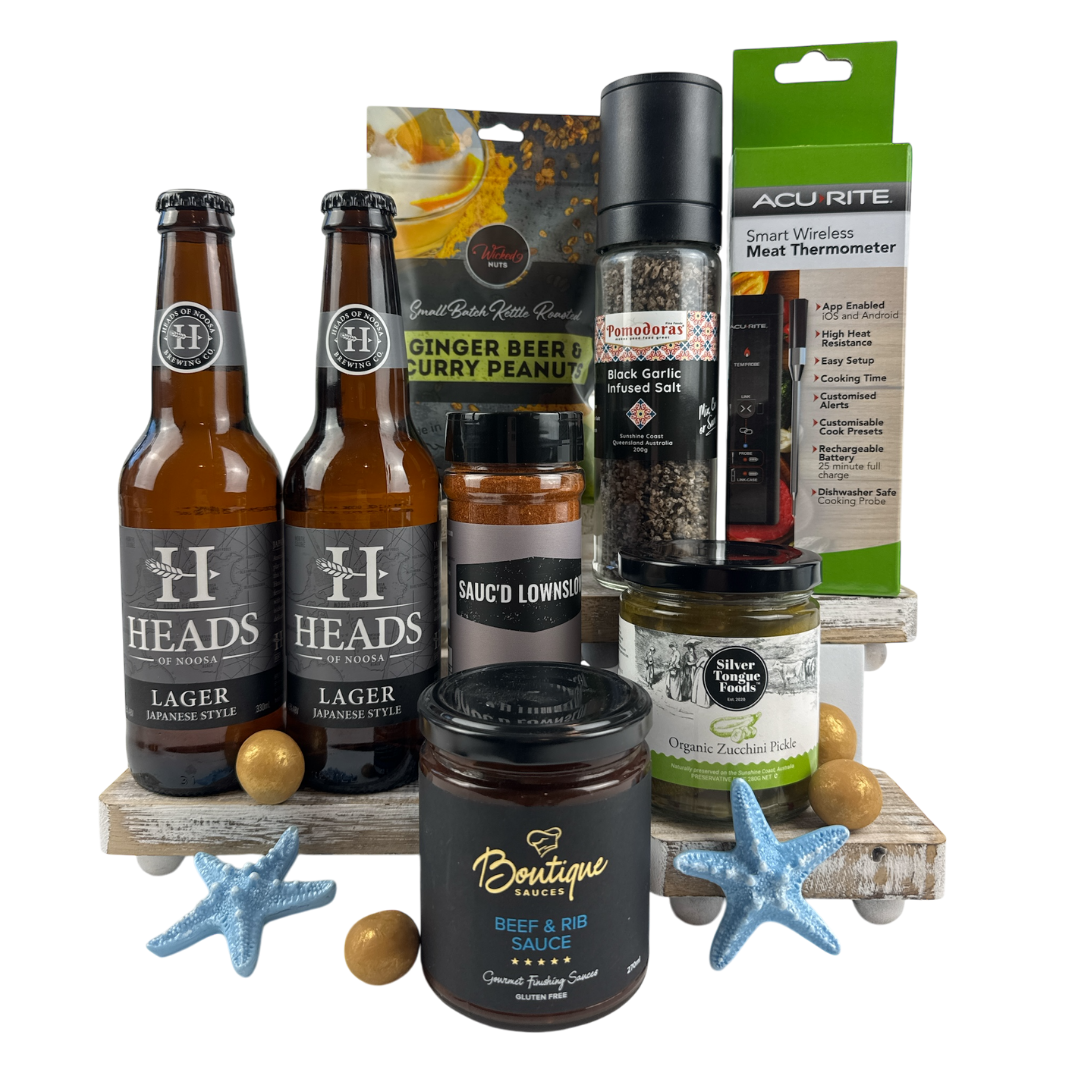 Fire up the flavour with The Grill Master – a bold hamper designed for lovers of the barbecue. Featuring two crisp Heads of Noosa Japanese Lagers, a smart wireless meat thermometer for precision cooking, and a selection of premium Sunshine Coast flavours like Pomodoras Black Garlic Salt, Wicked Nuts Ginger Beer & Curry Peanuts, and Silver Tongue Organic Pickles. Add in a weekend-ready spice rub and rich beef & rib sauce, and you’ve got a gift that turns any cookout into a gourmet event.