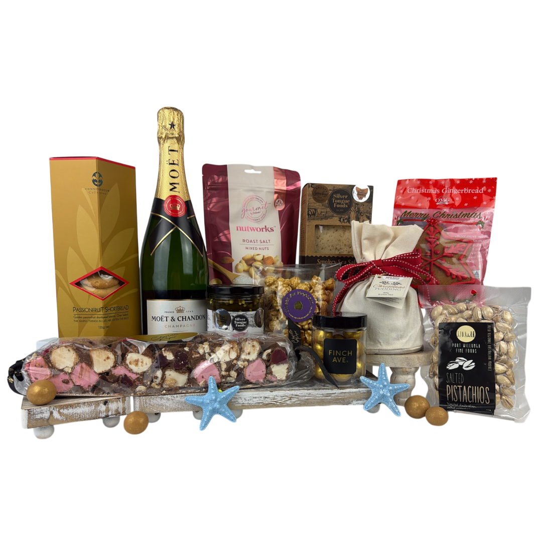Our Xmas Celebrations Hamper is a festive feast for the senses. Featuring Moet & Chandon Brut alongside a rich Maleny Cuisine Christmas pudding, it’s paired with Sunshine Coast favourites like Silver Tongue smoked sea salt crackers, Cowboy Kisses candied jalapeños, Blond Macnuts, and Sweet Az Heavenly Caramel popcorn. Enjoy Port Willunga salted pistachios, Nutworks gourmet salted nuts, Charlotte Piper rocky road, and Connoisseur Collection passionfruit shortbread. Finished with an Oh My Gingerbread Christmas Star, this hamper delivers local luxury and Christmas cheer in every bite.