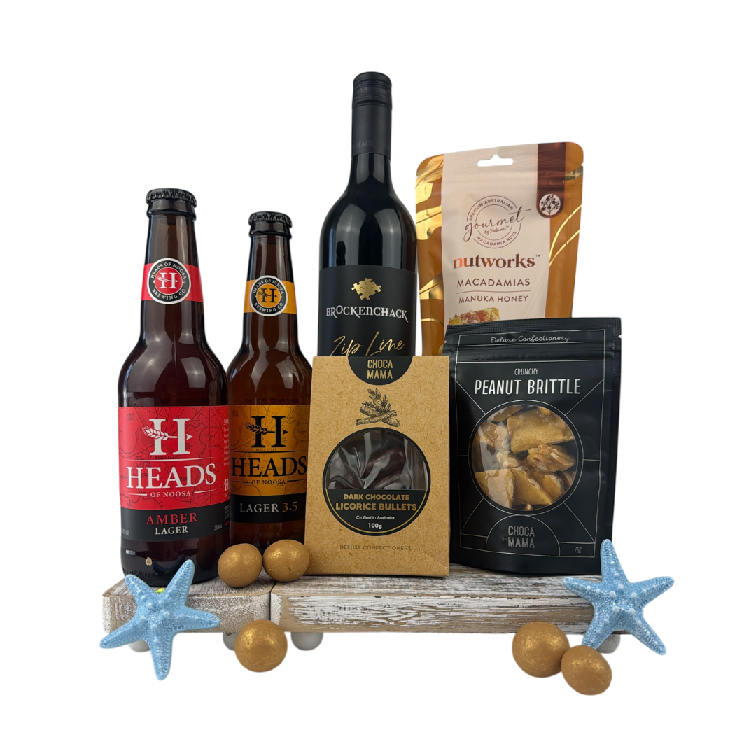Raise a toast this festive season with the Christmas Cheers Hamper, featuring Brockenchack Shiraz, craft beers from Heads of Noosa, Manuka honey macadamias, and delicious Chocamama chocolates. Perfect for holiday celebrations or gifting.
